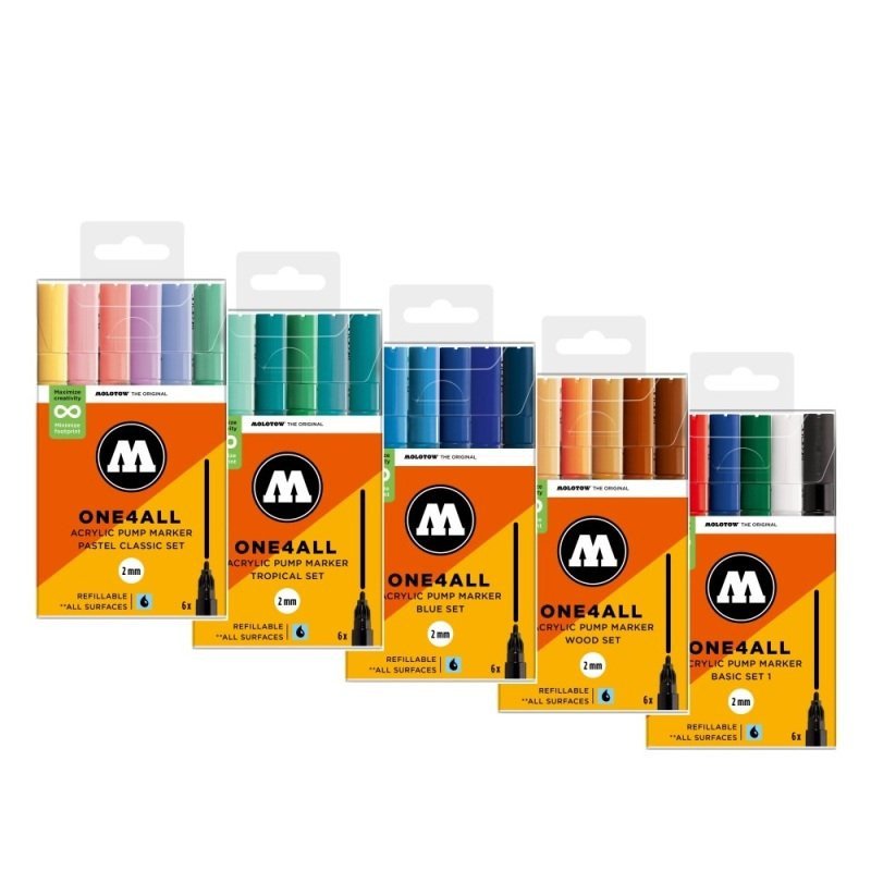 Komplektas - 6 vnt. Akrilo pagrindu. Linija - 2 mm. Pusiau blizgus. Labai neskaidrūs. Kapiliaru sistema. Labai greitai džiūsta. Skiedžiami vandeniu arba acetono. Tinka beveik visiems paviršiams.. Užpildymas min 50 k. Vidaus ir lauko naudojimui. Keičiamos galiukas. Pagaminta Vokietijoje
