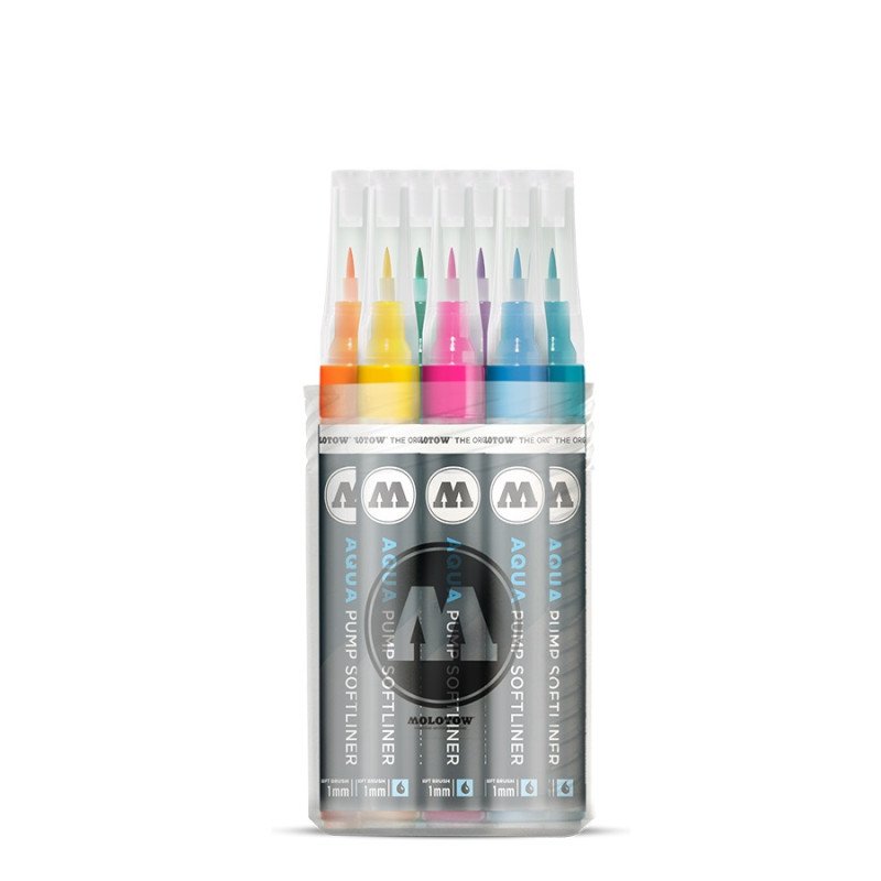 Komplektas - 12 vnt. Vanduo pagrindu. Linija - 1 mm. Kapiliaru sistema. Labai greitai džiūsta. Skiedžiami vandeniu. Tinka beveik visiems paviršiams.. Užpildymas min 50 k. Vidaus naudojimui. Keičiamos galiukas. Pagaminta Vokietijoje