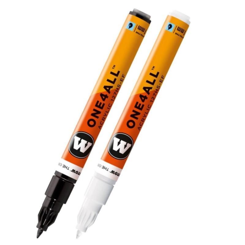 Akrilo pagrindu. Linija - 1 mm. Pusiau blizgus. Labai neskaidrūs. Kapiliaru sistema. Labai greitai džiūsta. Skiedžiami vandeniu arba acetono. Tinka beveik visiems paviršiams.. Užpildymas min 50 k. Vidaus ir lauko naudojimui. Keičiamos galiukas. Pagaminta Vokietijoje