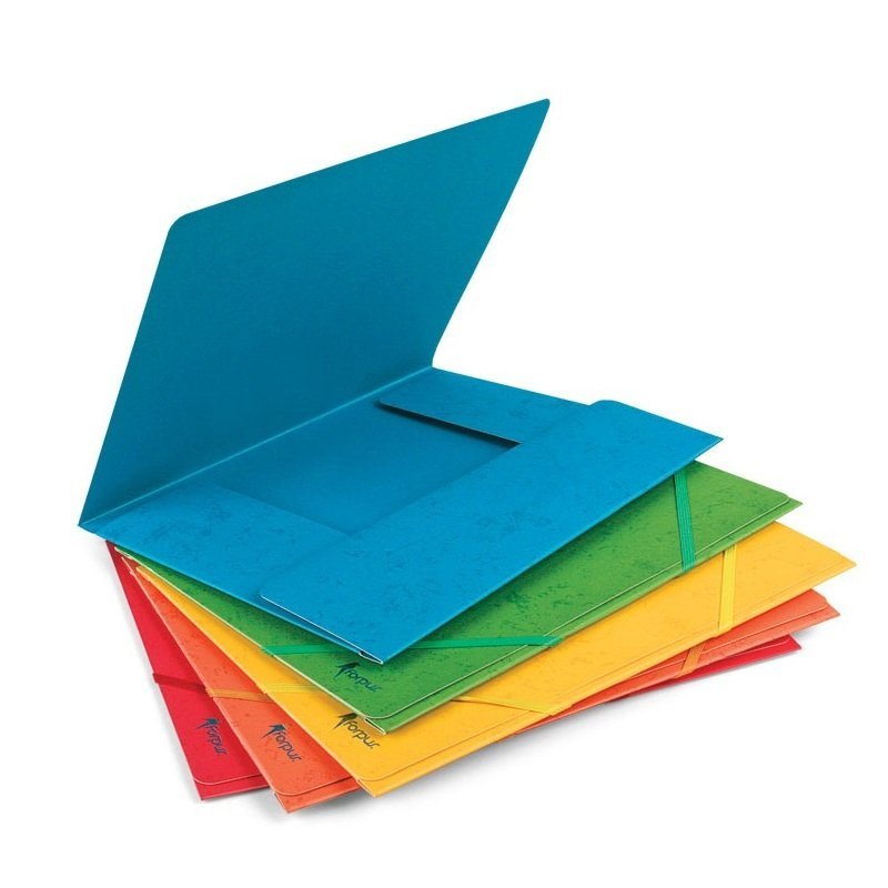 Aplankas kartoninis su gumelėmis. Pagamintas iš tvirto kartono. Su trimis atvartais. A4 formatas.