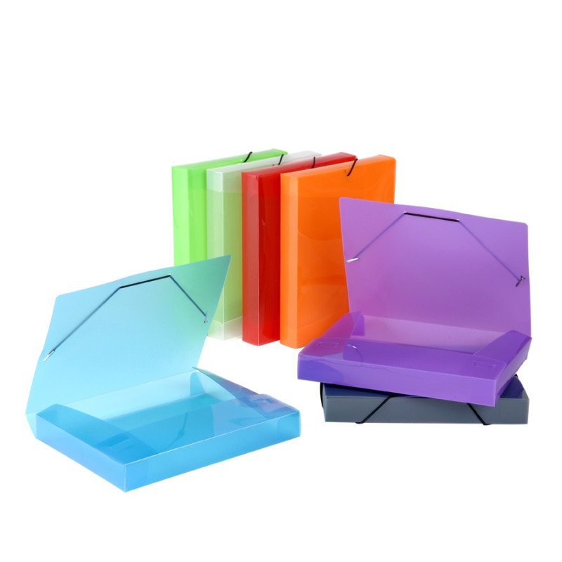 Dėklas PP su gumelėmis, skaidrūs. Nugarėlės plotis - 40 mm. Formatas A4+. Įvairių spalvų.