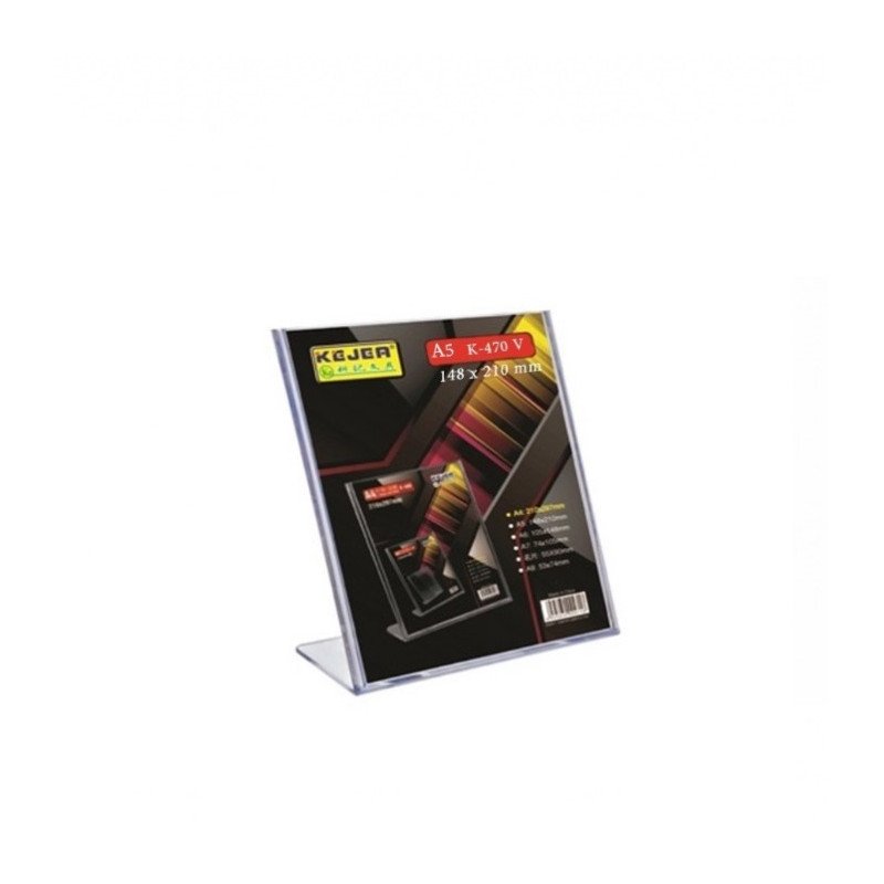 Lenktas ir vertikalus "L" formos, fromatas A5, stovas skirtas reklamos ar informacijos pateikimui. Informacija pateikiama iš vienos pusės. Pagamintas iš labai tvirto ir ypatingai skaidraus plastiko. Gali būti naudojamas viešbutyje, biure, mokykloje, ligoninėje, konferencijose, parduotuvėse ir t.t.