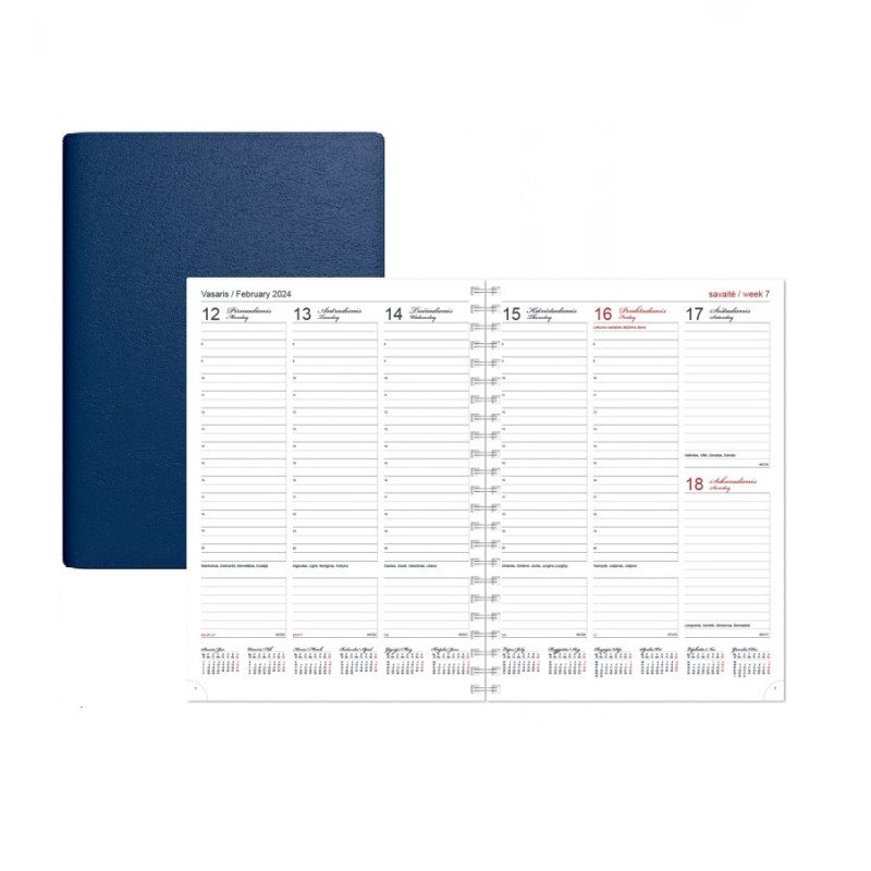 Darbo kalendoriaus „Futura“. Kalbos: lietuvių, anglų, rusų. A5 formatas. Vienas puslapis vienai dienai. 70 g/m2 baltas popierius. Perforuoti lapų kampučiai. Įrišimas su spirale.