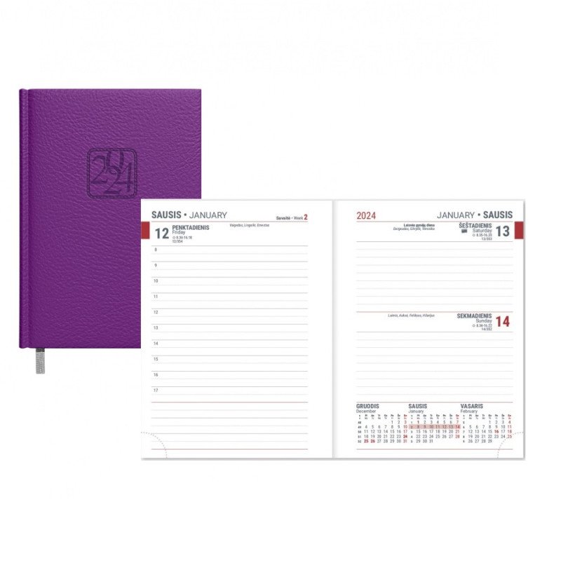 Kalendorius, skirtas darbų ir susitikimų planavimui. Dydis: 120x155mm. Kalbos: lietuvių, anglų. Susegimas: be spiralės. Minkštas PVC viršelis. Vienas puslapis skirtas vienai dienai, vardadieniai. Perforuoti lapų kampai. Juostelė lapams žymėti. Priedai: valstybinės šventės, 2021 ir 2022 metų kalendoriai, metų planavimas 2021 ir 2022 metams, kelių atstumai tarp miestų, pasaulio valstybių laikas, valiuta, kontaktiniai duomenys A-Z, pastabos (9psl.).