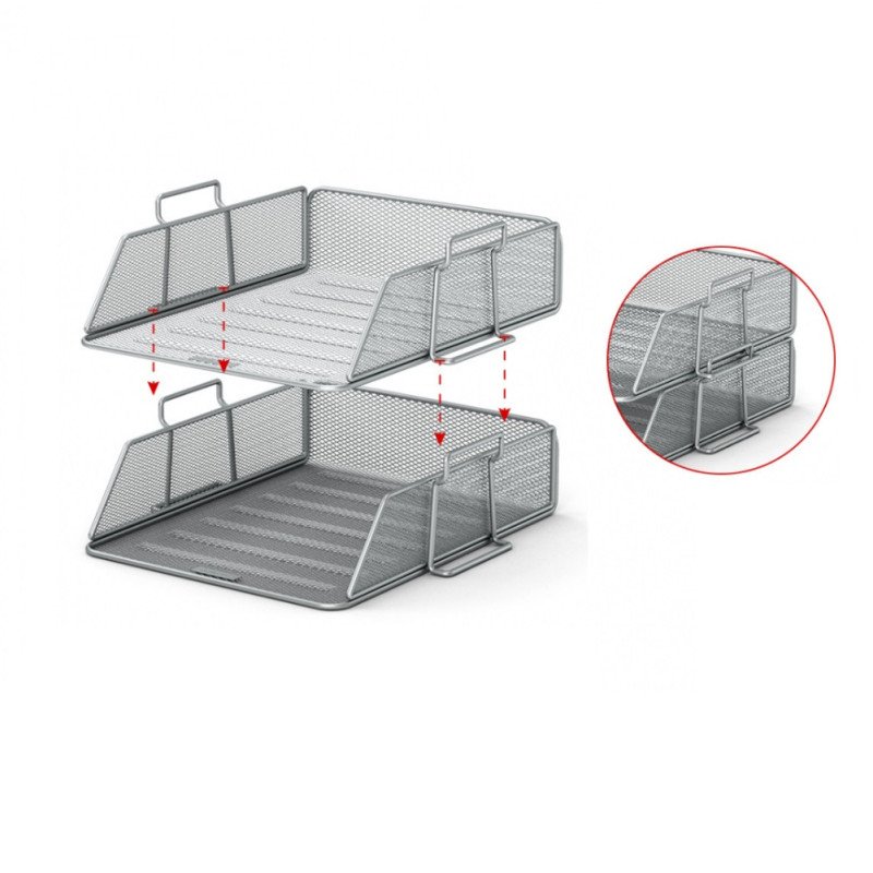Dokumentų lentynėlė metalinė ažūrinė. Skirtas laikyti ir klasifikuoti dokumentus. Pagaminta iš plieno tinklelio. Išmatavimai: 340 x 275 x 80 mm. Spalva: sidabrinė.