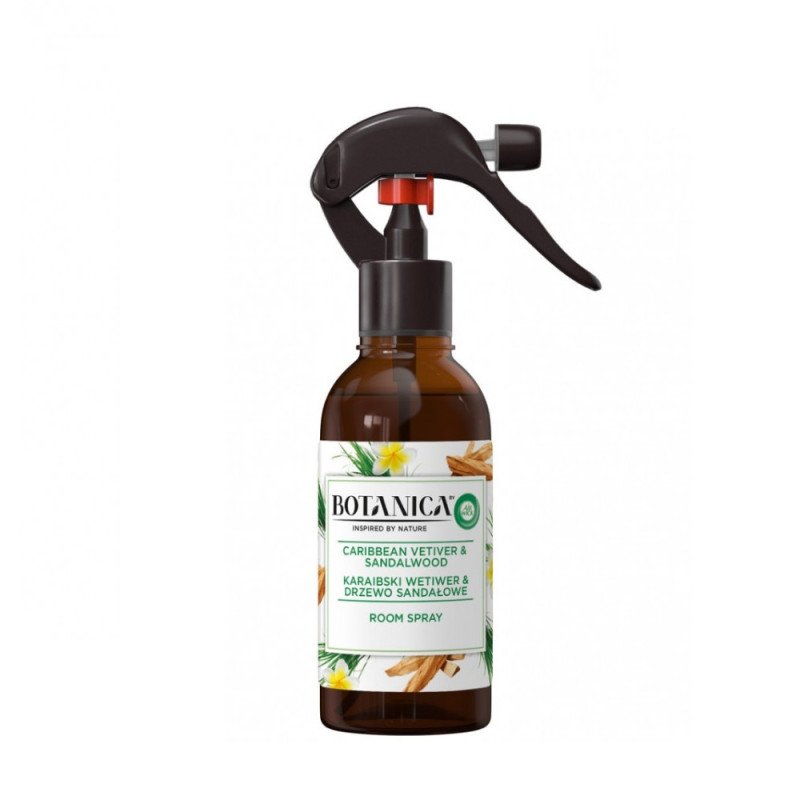 Oro gaiviklis Air Wick Botanica. Purškiamasis patalpų oro gaiviklis „Botanica by Air Wick“, karibinių vetiverijų ir santalų kvapo. Tai ne aerozolinis gaiviklis. Jis yra pagamintas naudojant atsakingai išgautus, egzotinius natūralius kvapiuosius aliejus. Buteliuko sudėtyje 99 % perdirbto plastiko. Purkštuko sudėtyje 35 % perdirbto plastiko. Produkto sudėtyje esantys eteriniai aliejai yra atsakingai išgauti. Kiekis: 236 ml.