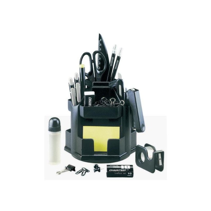 Juodos spalvos. Užpildyta: klijai, segiklis, žirklės, liniuotė, 2 pieštukai, sąsagėlės Nr.10, 2 tušinukai, teksto spalviklis, smeigtukai, maketavimo peiliukas, drožtukas, sąvaržėlės, spaustukai, laikiklis su lipnia juostele, užrašų lapeliai.