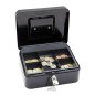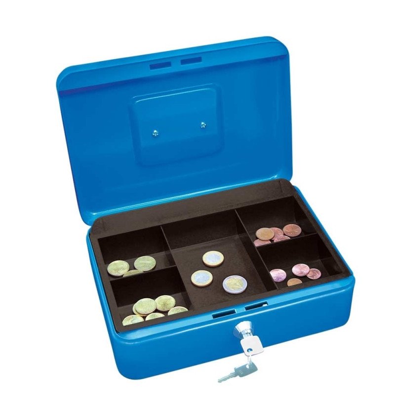 Pagaminta iš aukštos kokybės metalo. Viduje yra plastikinis dėkliukas skirtas popierinėms kupiūroms ir monetoms atskirti. Su spynele. Matmenys: 200 x 160 x 90 mm. Juodos spalvos.