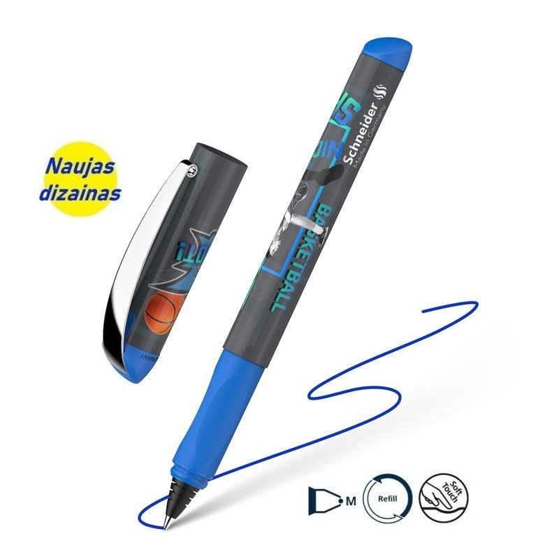 Rašiklis su ergonome laikymo zona. Tinka SCHNEIDER kapsulės. Brėžio storis 1.0mm. Mėlynos spalvos rašalas.