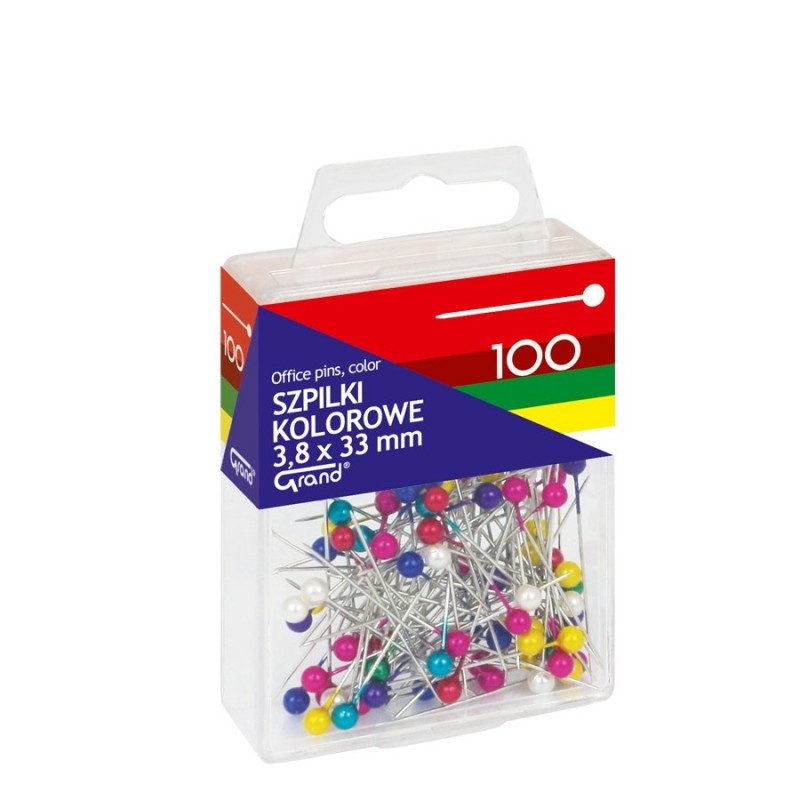 Adatėlės su spalvota, plastikine 3,5 mm skersmens galvute. Adatėlės ilgis 33 mm. Dėžutėje 100 vnt.