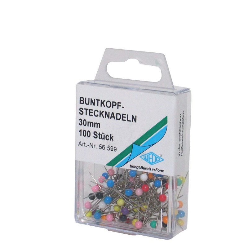 Adatėlės su spalvota, plastikine 3,5 mm skersmens galvute. Adatėlės ilgis 30 mm. Dėžutėje 100 vnt.