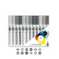 Komplektas - 12 vnt. Vanduo pagrindu. Linija - 1 mm. Kapiliaru sistema. Labai greitai džiūsta. Skiedžiami vandeniu. Tinka beveik visiems paviršiams.. Užpildymas min 50 k. Vidaus naudojimui. Keičiamos galiukas. Pagaminta Vokietijoje