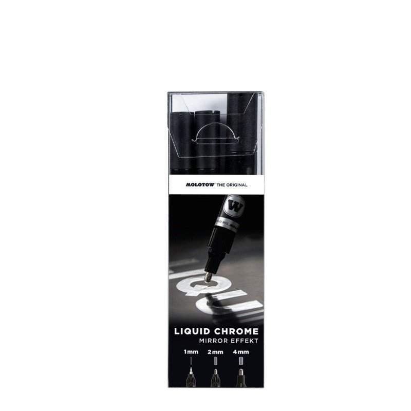 LIQUID CHROME yra žinomas dėl savo išskirtinio veidrodinio efekto, kuris ypač matomas ant nesugeriančių paviršių. Dėl keičiamų antgalių ir praktiško 30 ml užpildymo rašikliai gali būti naudojami vėl ir vėl.
